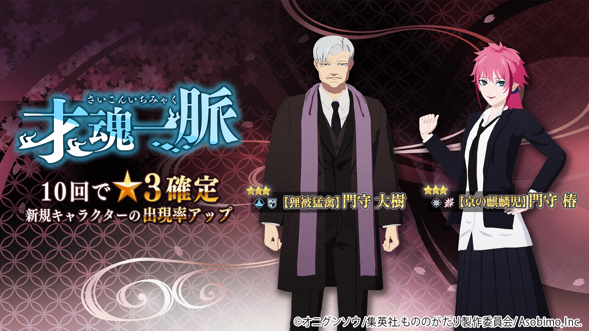 ピックアップ期間中は、新規キャラクター「【京の麒麟児】門守 椿」「【狸被猛禽】門守 大樹」の提供割合がアップしています。